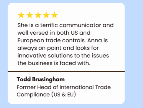With 13 years of experience, I specialize in simplifying complex EU and U.S. export regulations for companies that need clarity, confidence, and practical guidance. Over the years, I’ve worked across leading industries—including defence, aerospace, semiconductors, software and technology, and automotive—supporting organizations in navigating EU Export Controls as well as U.S. ITAR, EAR, and OFAC regulations. My approach is rooted in my proprietary C.L.E.A.R Export Compliance Framework, which transforms regulatory obligations into manageable, actionable steps.